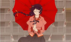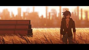 Dropping the audience in the middle of Araragi’s (Hiroshi Kamiya) story, a rush of computer-generated backdrops mixed with hand-drawn animation chronicle a young man painstakingly climbing a spiral staircase to access the roof. The sunlight drifts through, and sweat dissipates from his brow. There is a magnificent capture of crows on this rooftop, surrounding a tree that stretches well beyond the height of the building against an overcast sky. However, when the sun peaks through the cloud layer, Araragi suddenly combusts as the crows scatter. The next images are of Araragi plummeting from the structure on fire onto scaffolding erected on that side of the building.