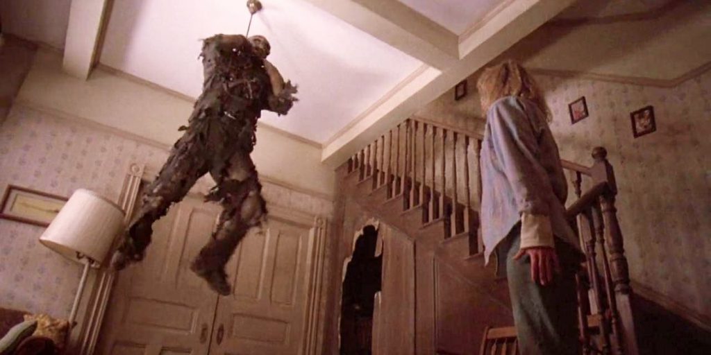 ​It’s a literal fireworks show. Tina uses her powers to choke Jason with a light cord, hit him with a sofa (because nothing says “Get out” like a divan to the face), drop a porch roof on his head, and set him on fire (because what’s a slasher climax without a human torch?)​