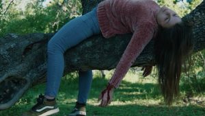 My biggest issue with the film is definitely the sharp, drastic transitional changes, particularly at the beginning. Though the parody elements at the start of the film are present in the endless parade of coeds exiting Willie’s station wagon and the catchy folk song playing as they arrive at the music festival, the transitional elements don’t feel like a bit. The film goes sharply from day to night and then sunrise into day during the first killing spree. There’s no atmosphere, but there is excessiveness, which is fun.