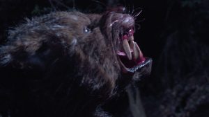 I single out “The Melonheads” because it is the segment Cryptids starts on, and I can imagine a few fans may have difficulty getting into the film. What “Melonheads” gets a lot of credit for is its fantastic use and commitment to practical effects. Throats are ripped out, intestines are eaten, facial features are distorted, and it’s glorious. The effects are so beguilingly satisfying for horror fans that none of the other stuff even bothers us. And that segment is just the tip of the carving knife. That tradition continues throughout the film’s remaining segments, “Bigfoot,” “The Loveland Frogman,” “Hopkinsville Goblins,” “Chupacabra Death Machines,” “The Dover Demon,” and “The Beast of Bladenboro.”
