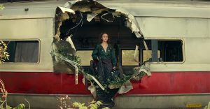 It happens on an abandoned train, and the girl tries to fight it off, but to no avail. Even though she weakens it with her hearing aid, the thing doesn’t back away, and when she shoots it, her aim isn’t good enough to kill it. It looks like this is the end of the line for her, but right at the last minute, Emmett finds them and shoots the monster in the head.