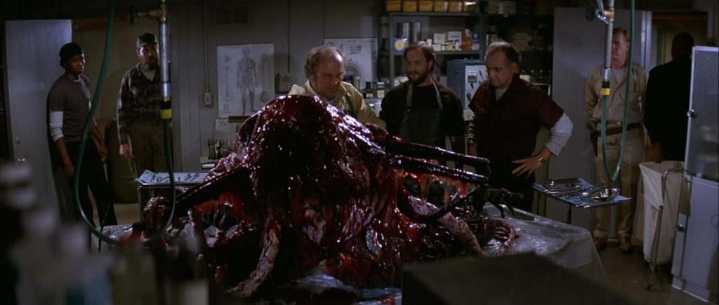 The Chest Defibrillation (The Big Mouth)​: This is the most jaw-dropping moment of The Thing. Norris is on the table, seemingly dead. Dr. Copper goes to shock his heart back to life with the paddles. Suddenly, Norris’s chest cavity opens up like a giant set of shark teeth and chomps Copper’s arms off. It’s a jump scare that pays off with literal splat.
