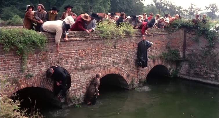 This creates a Folk Horror dissonance. You have these gorgeous landscapes, and then, right in the center of the frame, you have a man being hanged or a woman being swum in a pond. It’s the idea that the land itself is ancient and doesn’t care about human suffering. The sun keeps shining while Hopkins collects his blood money.​